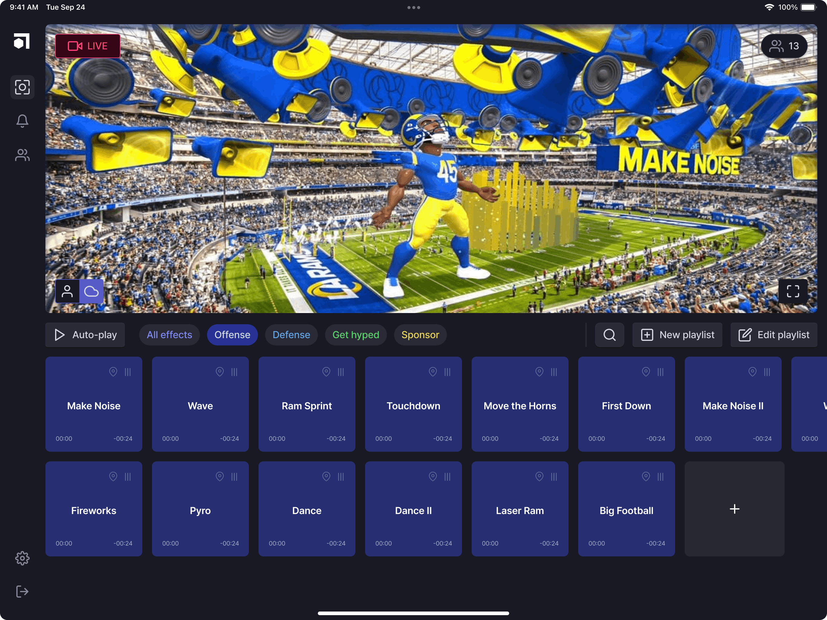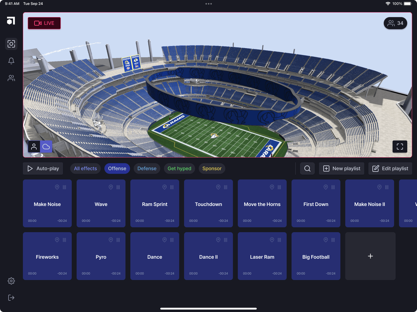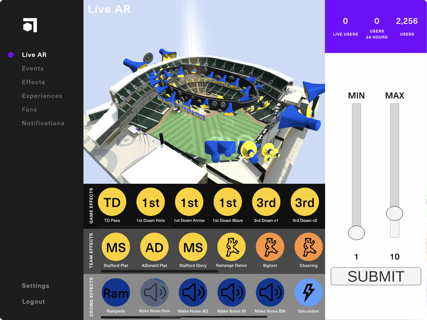 A fan can open ARound on their phone, sync it with the stadium, and see 3D effects, interactive games, and stats through the camera on the field in real time. This producer app runs on an iPad behind the scenes and a stadium team member can trigger effects and fun content the fan will see on their phone! Magic!